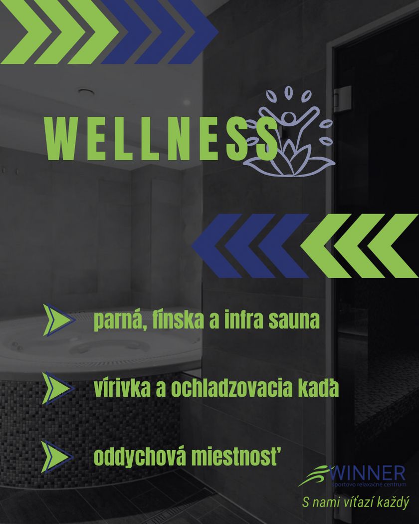 Pre všetkých, ktorí hľadajú uvoľnenie po namáhavom dni, ako aj pre tých, ktorí chcú len zrelaxovať, ponúkame služby Wellness centra. U nás dosiahnete dokonalý oddych a relax pre celé telo i myseľ. Dokonalé uvoľnenie zažijete v našich saunách, vírivom bazéniku a oddych umocní relax na vyhrievaných ležadlách v tepidáriu. Ponúkame Vám privátnu atmosféru a pre umocnenie zážitku Vám na bare môžu ponúknuť i menšie občerstvenie.